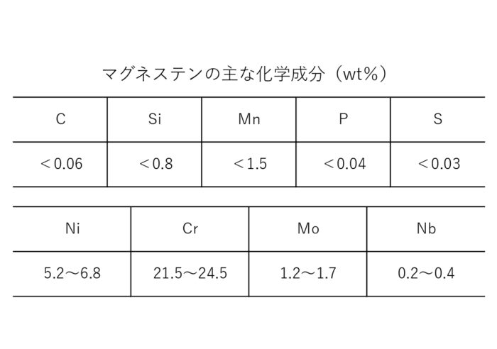 マグネステンの成分は次の表の通りSUS329J1に準じた成分となっています。オーステナイト相とフェライト相、両方の特徴を持った2相ステンレスとなります。 |