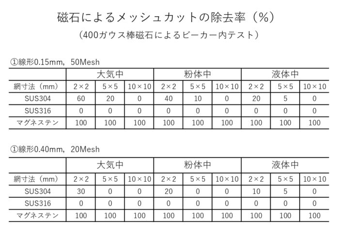 磁石に反応するので、製造ライン中に万が一破損後の破片が混入しても金属検知機での検出や、マグネットキャッチャーでの回収が容易になります。次の表はビーカー内をそれぞれの環境下にし、金網を小さい破片にカットした物を混入させた場合の磁石での回収率です。マグネステンは高い磁性を有しており、容易に異物混入対策が可能となります。 |