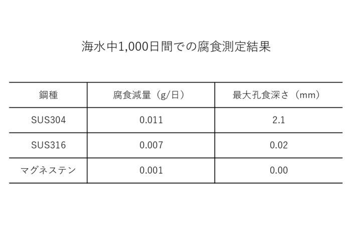 最大の特徴でもある耐食性はSUS316などと比較しても塩素系腐食に対して優れた特性を持っております。塩分が含まれる食品製造ラインなどでご採用頂いており通常のステンレス金網よりも交換頻度が減る傾向にあります。次の表はそれぞれの材質を海水中に1000日間浸けた場合の腐食具合の結果です。マグネステンはほぼ100%残留強度を有しています。 |