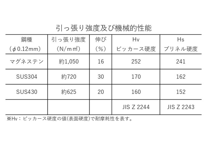SUS304やSUS430と比較し硬度、引っ張り強度が高く耐摩耗性と機械的性質において優れた特性を持っております。次の表は各材質の耐摩耗性と機械的性質を示したものです。マグネステンは他の材質と比較し硬度が約50%高い為、耐摩耗性が優れていることになります。また、引っ張り強度が約45%強い一方、伸びが16%と低い為、金網に製作することがやや難しくなります。しかし、弊社では長年にわたり取り扱ってきた経験と技術により豊富な種類の金網を製作することを実現しています。 |